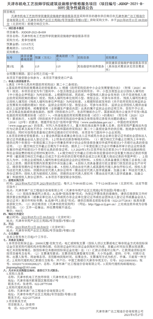 天津市機(jī)電工藝技師學(xué)院建筑設(shè)施維護(hù)維修服務(wù)項(xiàng)目